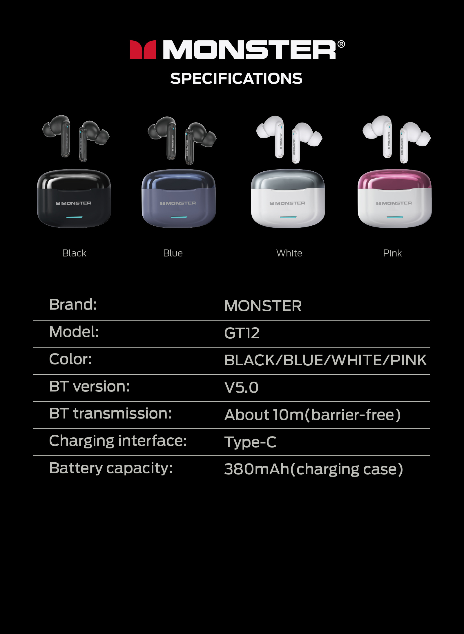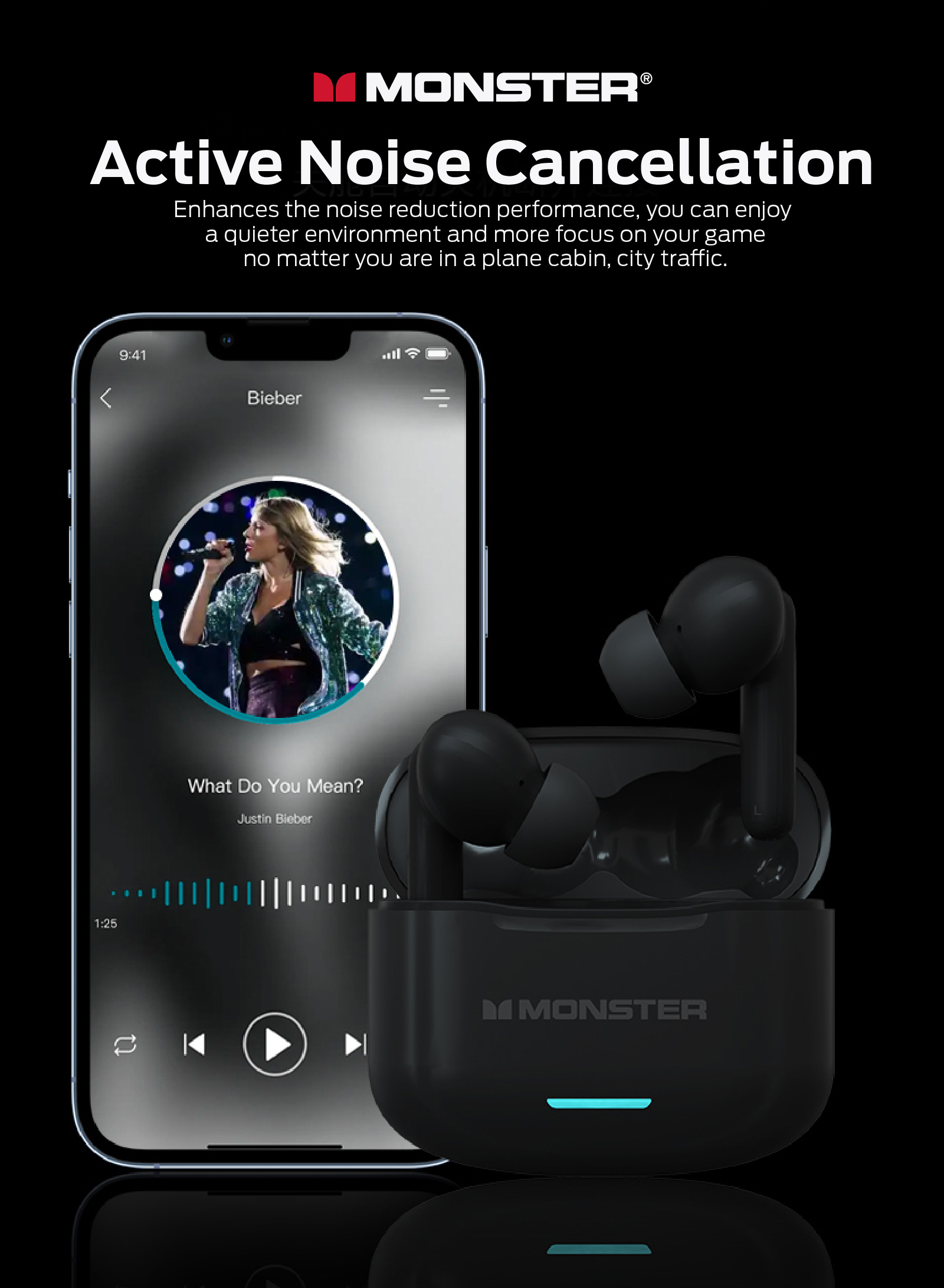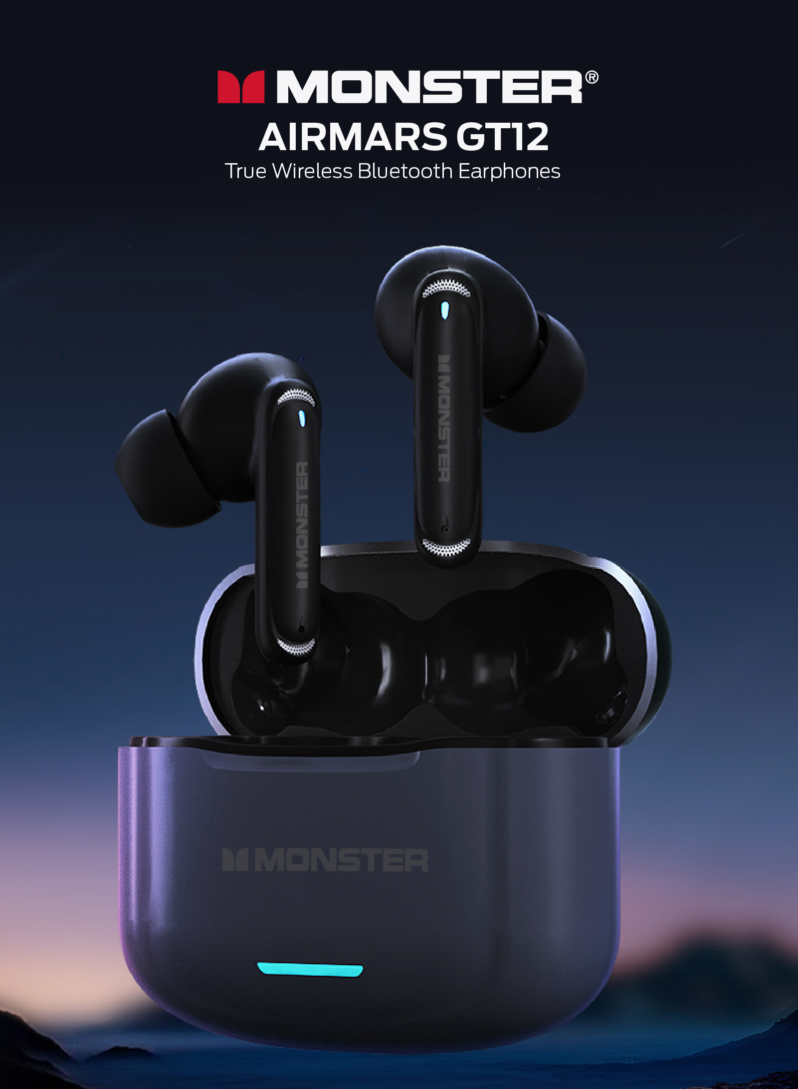 Monster Airmars GT12 真無線主動降噪耳機,65ms超低延遲,開蓋即連,單次使用約7小時,整體續航可達30小時,全新自適應降噪技術,實時判斷所在環境的噪音強度,自動匹配適宜的降噪模式