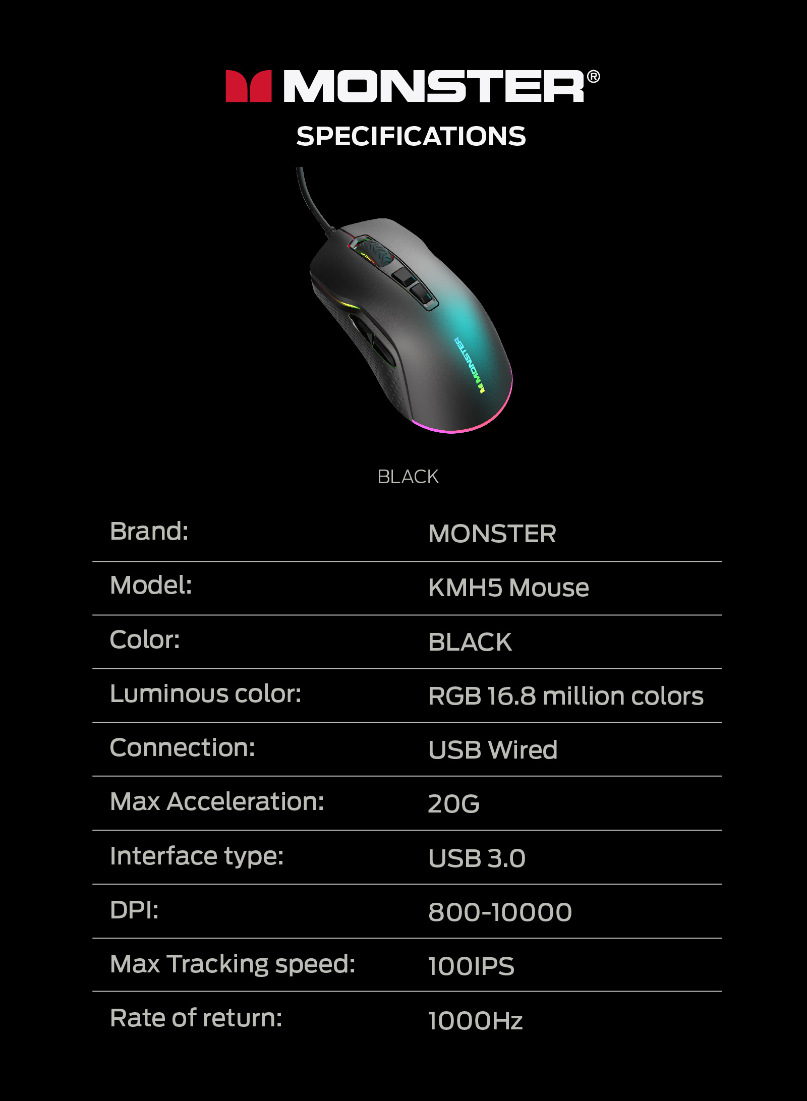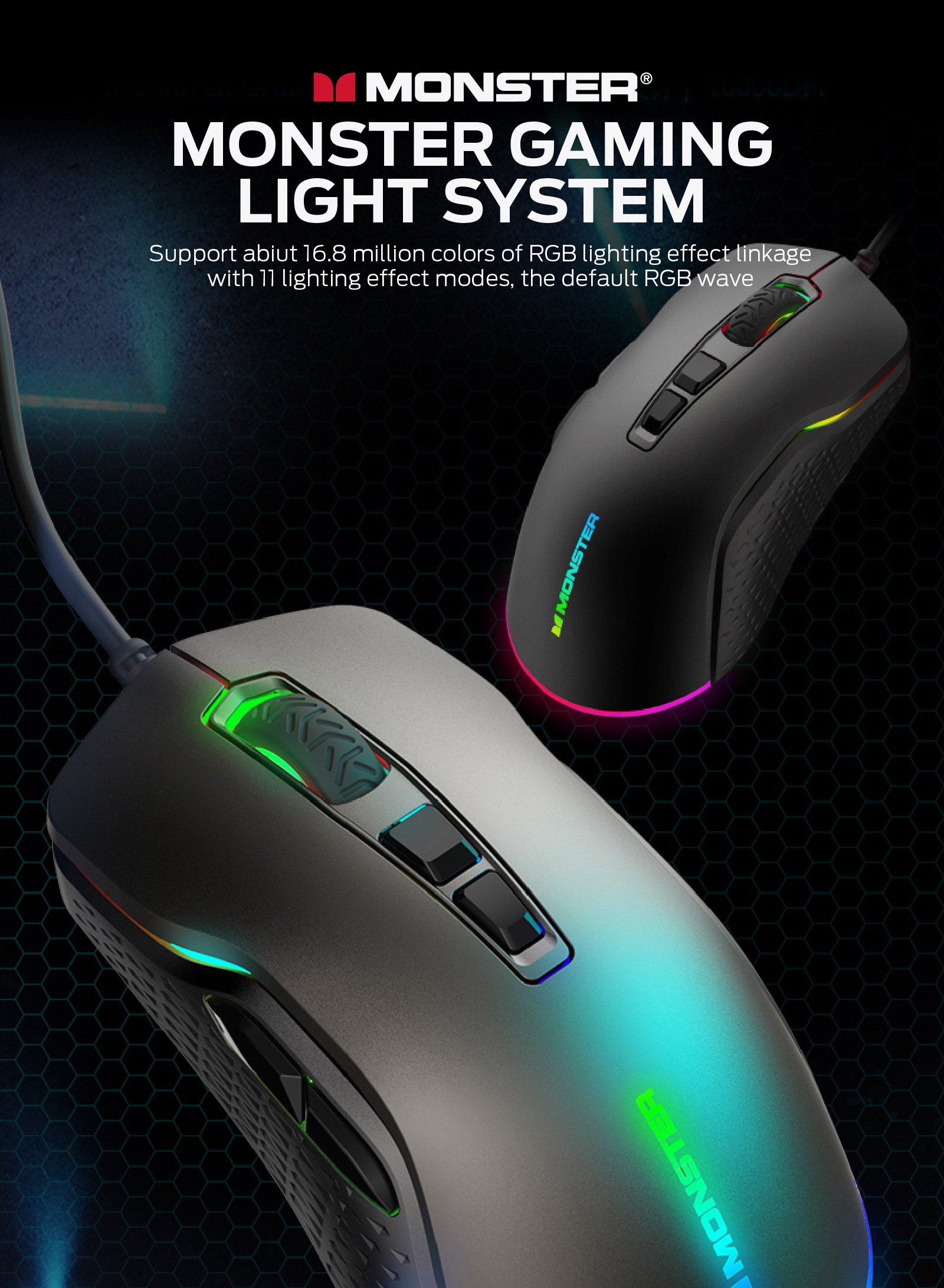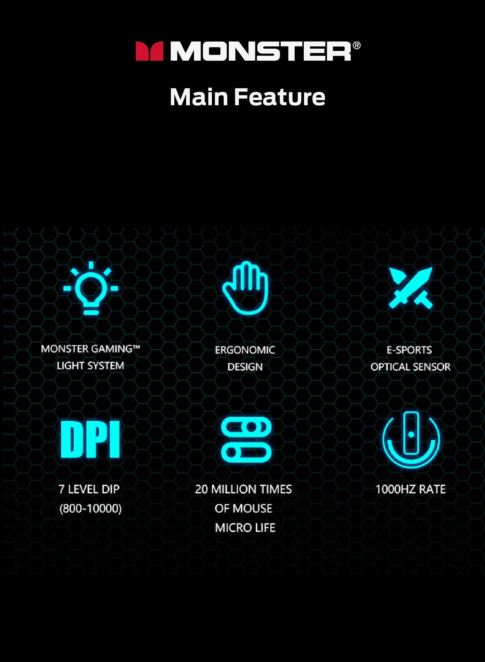 人體工學設計,握感舒適, 電競級光學傳感接口 3.7級DPI(800-1200-1600-2400-3600-5000-10000), 紅綠藍黃綠紫白,默認1200,帶內存2000萬次微動, 1000HZ收益率, MONSTER GAMING 燈光系統