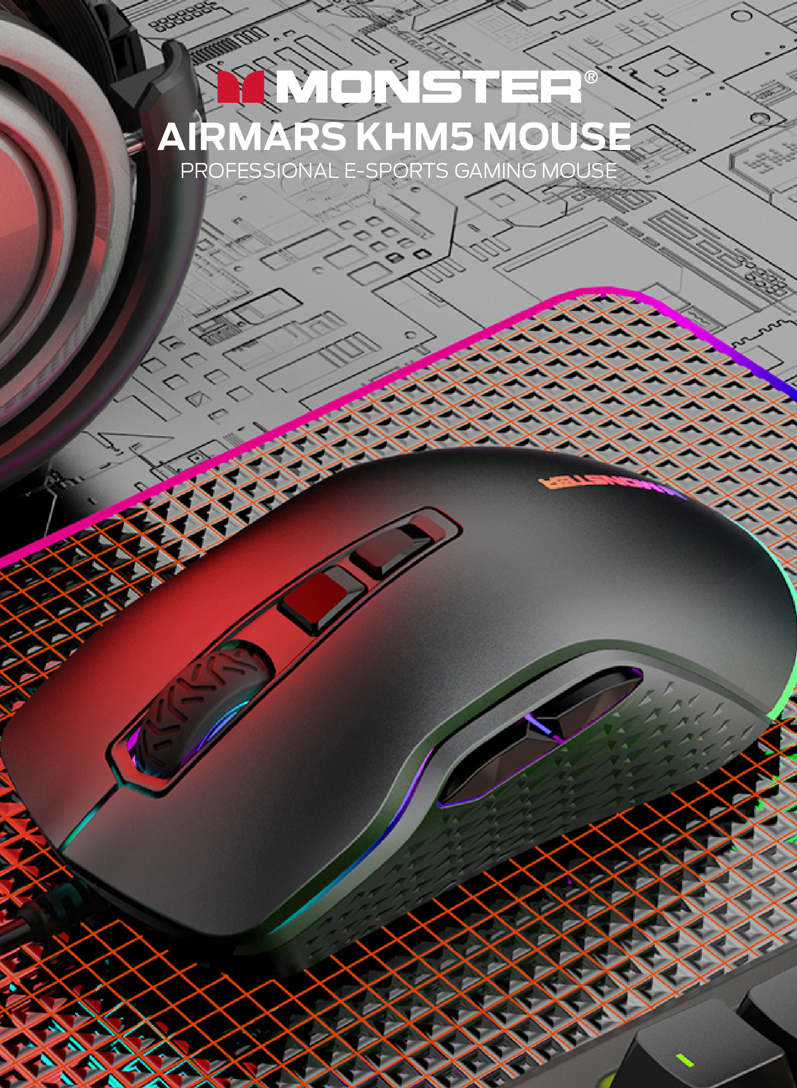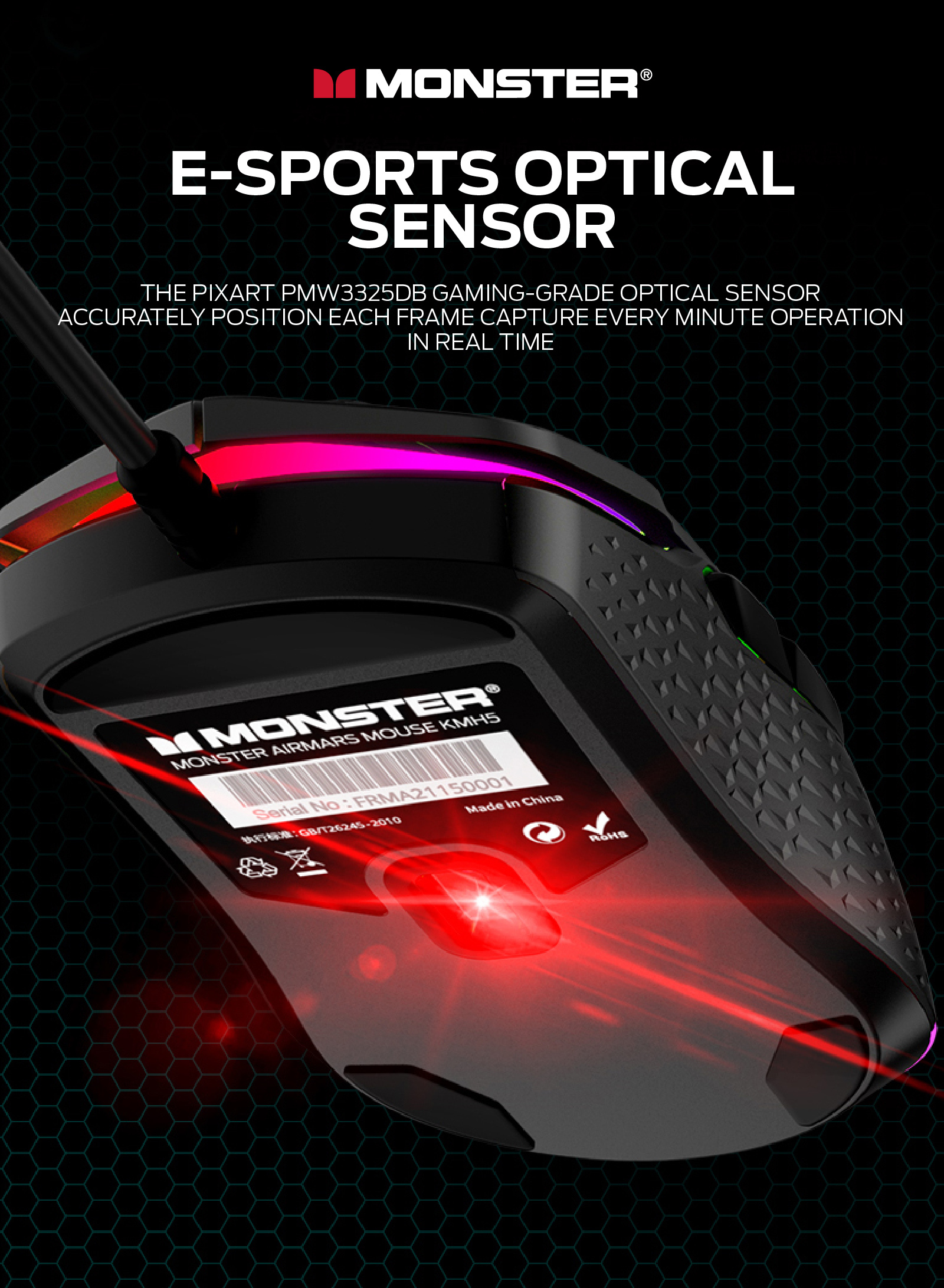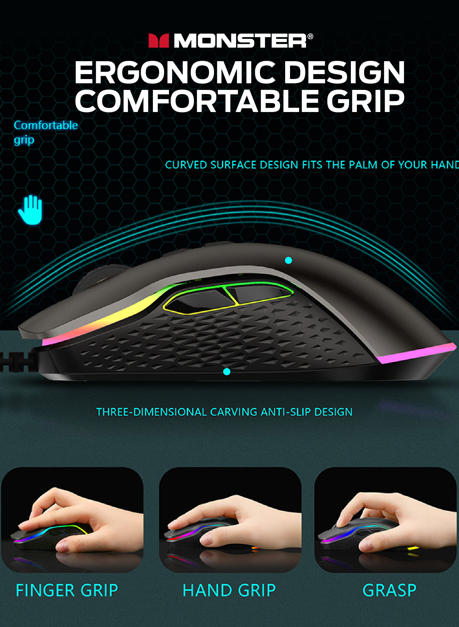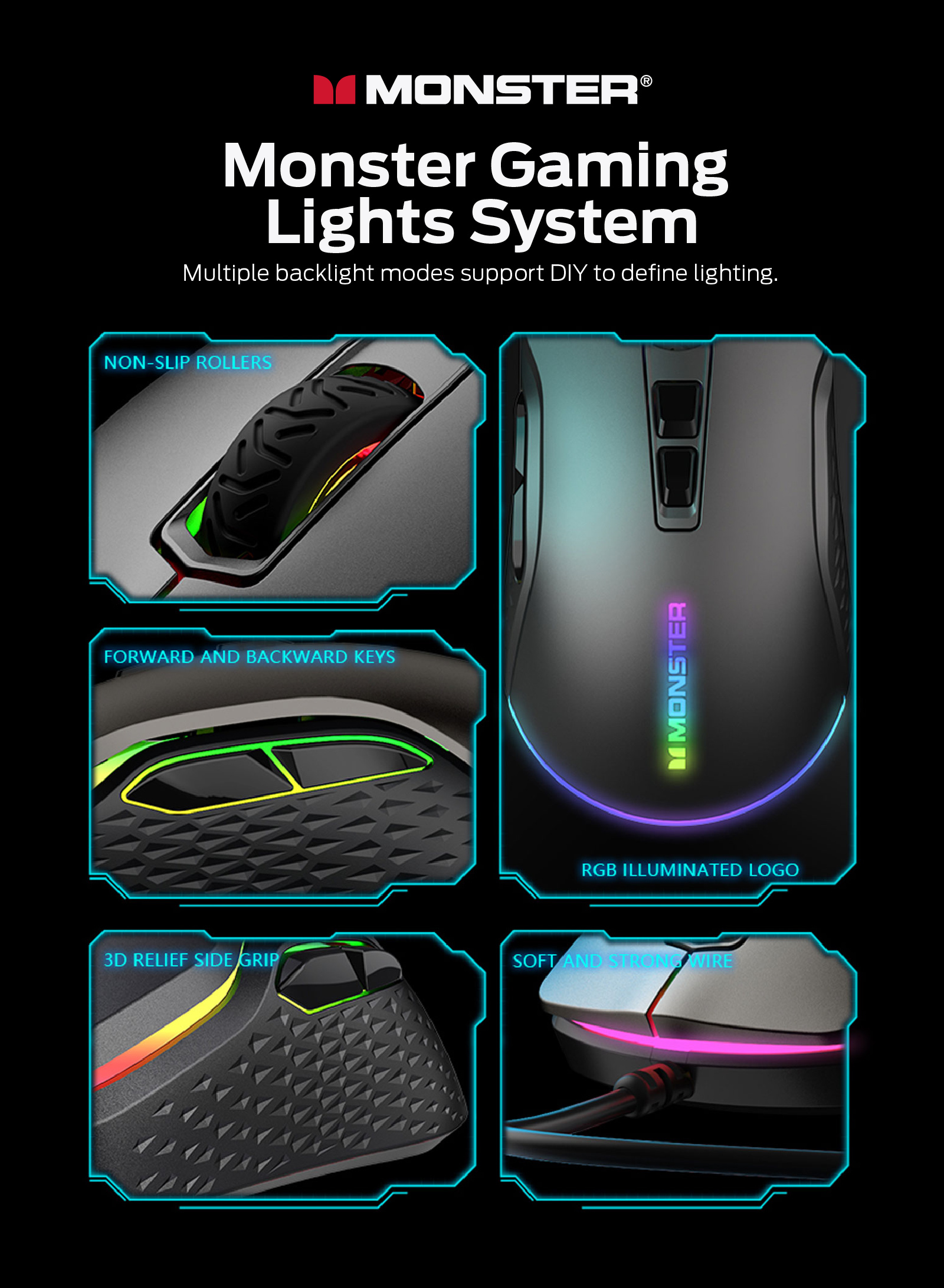 人體工學設計,握感舒適, 電競級光學傳感接口 3.7級DPI(800-1200-1600-2400-3600-5000-10000), 紅綠藍黃綠紫白,默認1200,帶內存2000萬次微動, 1000HZ收益率, MONSTER GAMING 燈光系統