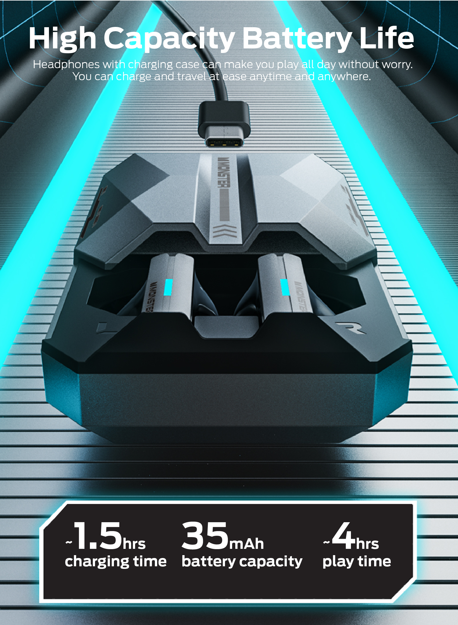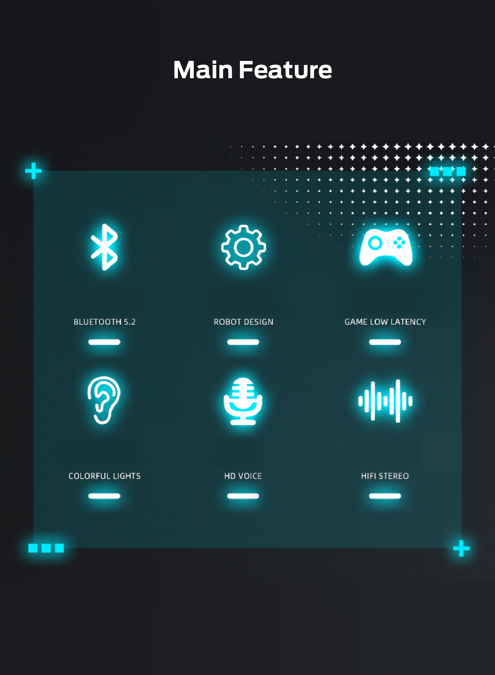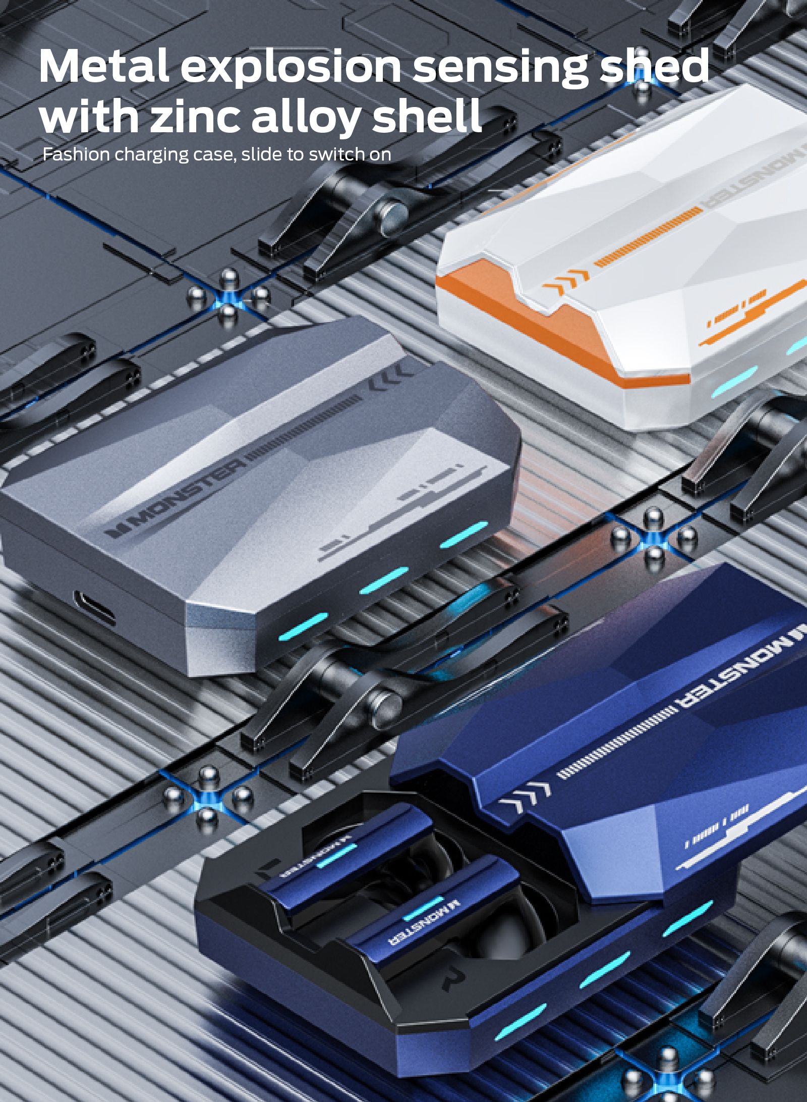 鋅合金外殼 金屬感澎湃,時尚滑蓋開關,高清通話,HIFI立體聲,13MM大動圈單元,低遊戲延遲+遊戲音效,時尚冰藍燈效, 藍牙5.2, 配合充電盒播放約17小時