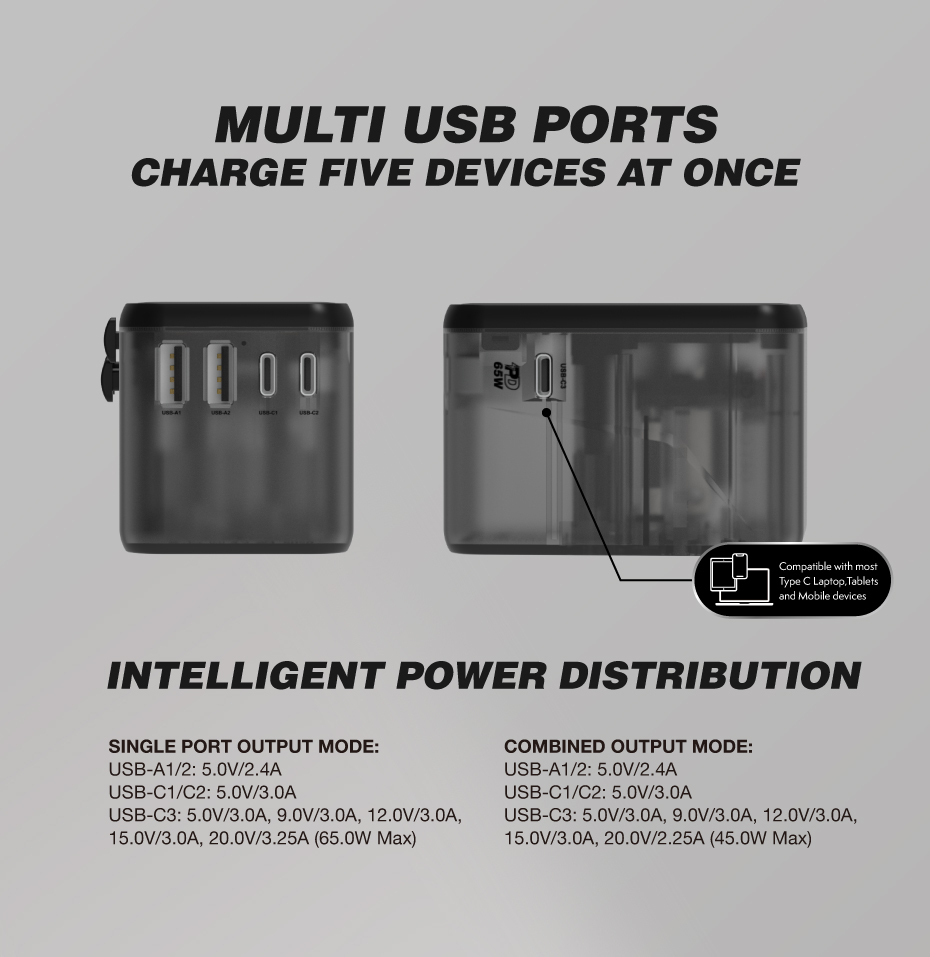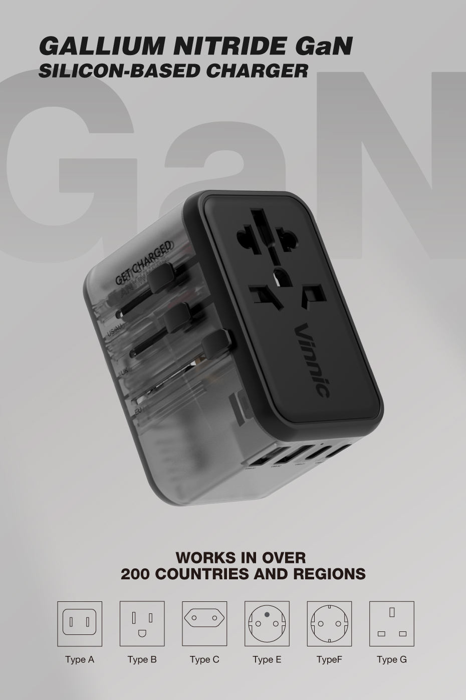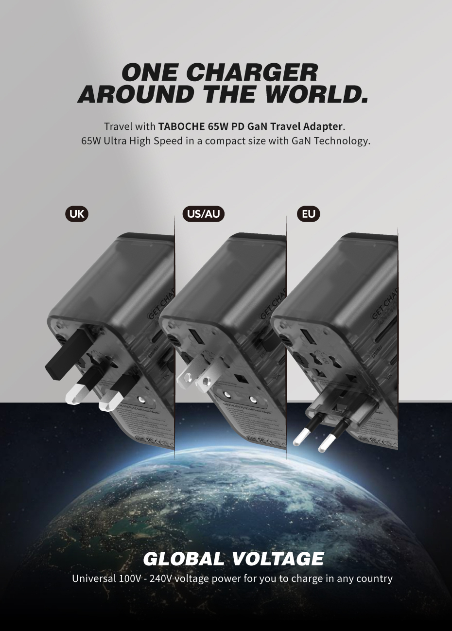 帶著 Vinnic Taboche 65W PD GaN 旅行適配器旅行。 Taboche 為您提供採用 GaN 技術的 65W 超高速。一個轉插器,環遊世界。